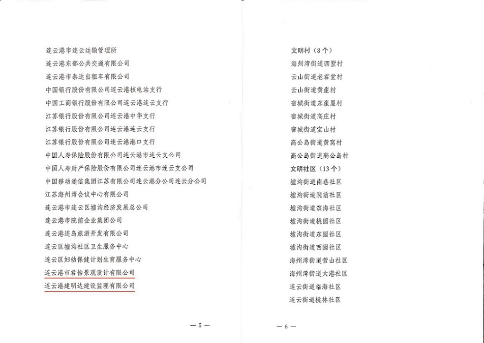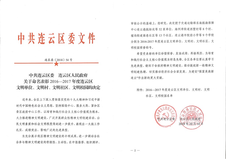 10月10日,中共連云區(qū)委、連云區(qū)人民政府發(fā)布《關于命名2016-2017年度連云區(qū)文明單位、文明村、文明社區(qū)、文明校園的決定》,我單位被授予“區(qū)文明單位”榮譽稱號。這是我單位精神文明創(chuàng)建工作的又一項豐碩成果。