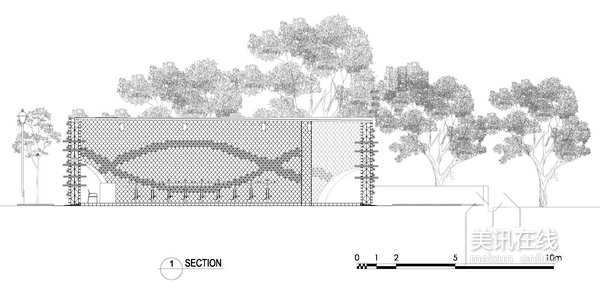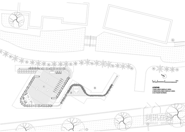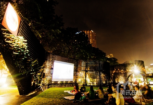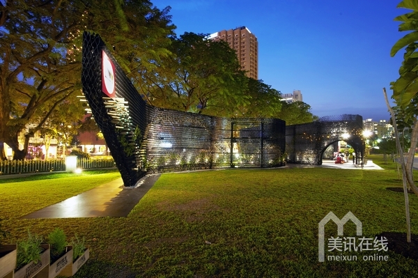 活動(dòng)的實(shí)施;另一方面,亭閣外圍設(shè)計(jì)了兩個(gè)外層表面,波紋狀的墻面設(shè)計(jì)非常吸引人眼球,是一道非常亮麗的景觀設(shè)計(jì)。