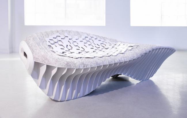 是否想過你的家具是由堆肥組層的?這個(gè)問題的提出伴隨著一系列有關(guān)生物制造長(zhǎng)椅的研究。 Terreform ONE和Genspace公司聯(lián)手開發(fā)了兩張生物塑料椅。生成的兩把椅子采用了類似的過程:一把由白色肋骨構(gòu)成的參數(shù)化外形的躺椅,椅子上加了柔軟的墊子。另一把是兒童椅,它將分段的各部分內(nèi)部連接起來(lái),這樣的方式可以讓使用者根據(jù)需要改變其形狀。